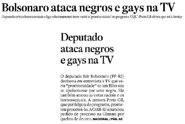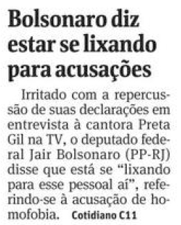 À Rádio Tupi, do Rio, Bolsonaro voltou a dizer ontem que não é racista (ele já havia dito que a mulher é afrodescendente e o sogro, negão), mas ampliou os ataques aos gays. Para ele, é preferível uma criança morar na rua a ser adotada por um casal gay (Folha de S. Paulo, 01 abr. 2011, P. C4).