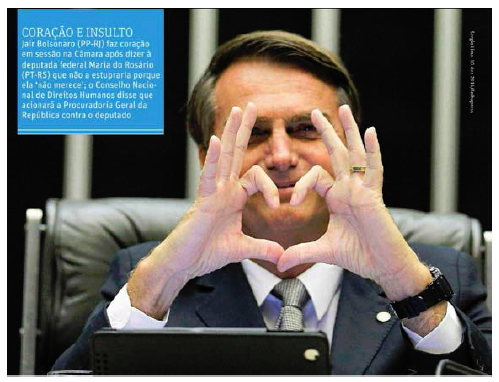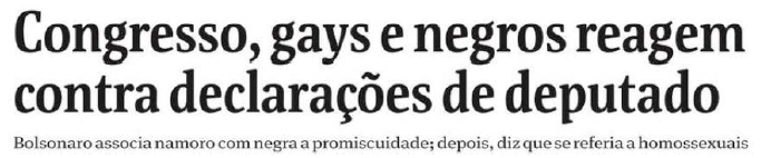 Na terça-feira, o deputado Jair Bolsonaro (PPB-RJ), capitão da reserva do Exército, colocou a foto de FHC segurando a bandeira gay na porta de seu gabinete, com a frase ‘Eu já sabia...’. Questionado, Bolsonaro não quis revelar como termina a frase. ‘O objetivo é tirar sarro’, disse, sem conter a risada. ‘Não vou combater nem discriminar, mas, se eu ver (sic) dois homens se beijando na rua, vou bater’ (Folha de S. Paulo, 19 mai. 2002, p. C9).