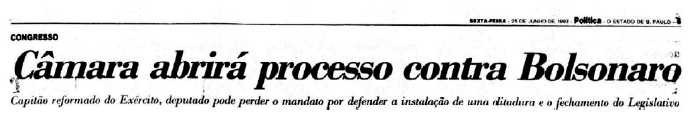 De início, algumas questões precisam ser levantadas. Por que escolhemos matérias de jornais impressos no intento de esboçarmos a carreira político-midiática de um deputado federal? Uma segunda questão diz respeito à escolha dos jornais: por que jornais predominantemente do estado de São Paulo, sendo que o deputado em questão sempre teve seus mandatos vinculados ao estado do Rio de Janeiro? Por fim, existe a justificativa, nem um pouco óbvia, das motivações e da relevância de tratarmos de um político com o perfil do deputado Jair Bolsonaro.
