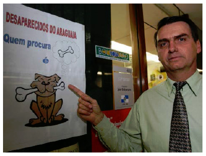 Único parlamentar a defender abertamente a ditadura militar, Bolsonaro afirma que está fazendo um protesto contra as indenizações ‘bilionárias’ concedidas aos ex-presos políticos. ‘A mentira deles não é a verdade da história. O povo tem de dar graças a deus aos militares. Tenho o direito de me expressar’, diz o parlamentar. O cartaz da discórdia foi feito em 2005 para provocar o então ministro da Casa Civil, José Dirceu, que havia feito um discurso na Casa. Ele disse: ‘vamos atrás dos ossos...? Na ocasião não houve repercussão’, diz Bolsonaro. (O Estado de S. Paulo, 28 mai. 2009, p. A11).