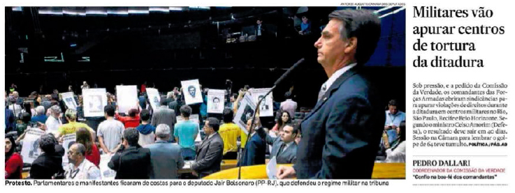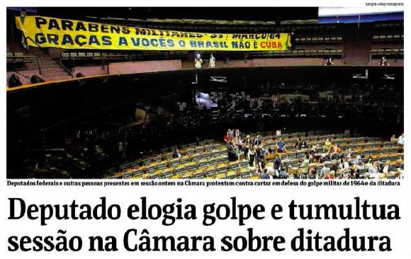 Cinquenta anos após o golpe militar de 1964, diversos eventos aconteceram no Brasil para relembrar e debater o tema. Entre eles uma sessão solene organizada pela então deputada federal Luiza Erundina. O deputado Jair Bolsonaro compareceu à sessão com uma faixa com os dizeres “Parabéns militares 31 de março de 64. Graças a vocês o Brasil não é Cuba”, causando um alvoroço entre os participantes e indo direto para as páginas dos jornais. A imagem da Folha de S. Paulo abaixo retrata a referida faixa exposta por Bolsonaro junto com título da matéria (Imagem 11). No mesmo dia, a capa do jornal O Estado de S. Paulo apresentou os manifestantes, com fotos de desaparecidos políticos, de costas para o deputado quando ele subiu à tribuna para defender a ditadura militar (Imagem 12).