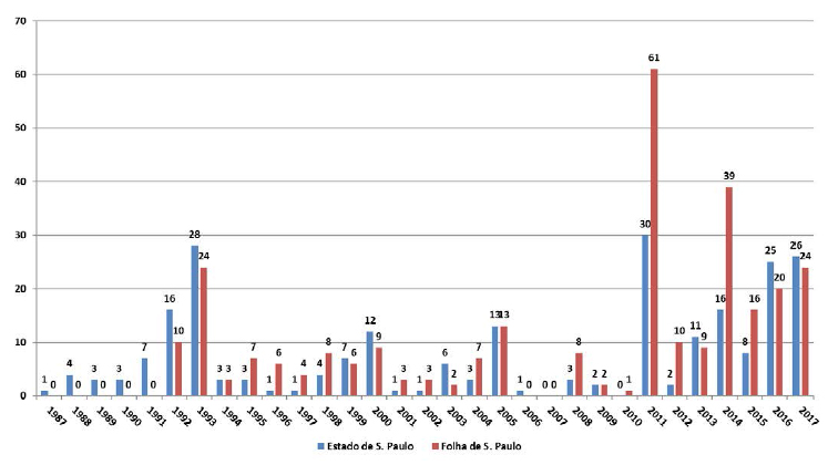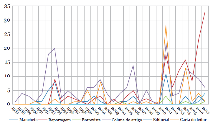 O Gráfico 2 apresenta a frequência de publicação das matérias analisadas de 27 de outubro de 1987 a 30 de novembro de 2017.