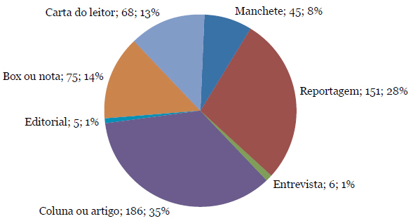As matérias analisadas apresentavam formatos diferentes (consequentemente extensões diferenciadas), o que vai condicionar tanto a presença/ausência de pautas políticas bem como as quantidades apresentadas. Os Gráficos 3 e 4 abaixo apresentam, respectivamente, o percentual total de formatos analisados nos dois jornais e a frequência de publicação dos formatos ao longo dos trinta anos.