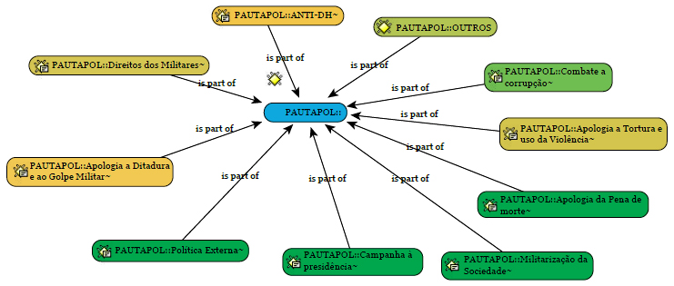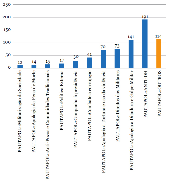 As pautas políticas contra os direitos humanos, a apologia à ditadura e ao golpe militar, a defesa dos direitos dos militares e a apologia à tortura e à violência ocupam a maior frequência de ocorrências. A categoria residual “Outros” (destacada em amarelo) engloba todos os posicionamentos do deputado em votações no Congresso, além de opiniões sobre os mais variados assuntos, como a concordância com frases fascistas do ditador Benito Mussolini (Folha de S. Paulo, 29 jul. 2013, p. E2), até colunas de humor. Por este motivo ela teve muitas ocorrências.