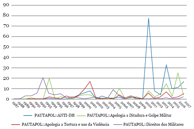 Embora a pauta contra os direitos humanos seja a mais prevalente nas matérias, a pauta de apologia à ditadura e ao golpe militar - por motivos ao mesmo tempo históricos e contemporâneos - ocupa um lugar de destaque e, por este motivo, foi deixada por último. A defesa do regime militar no Brasil sempre foi uma pauta política amalgamada à imagem pública do deputado (vide linha verde do Gráfico 6), recorrentemente mencionada em depoimentos, discursos e entrevistas.