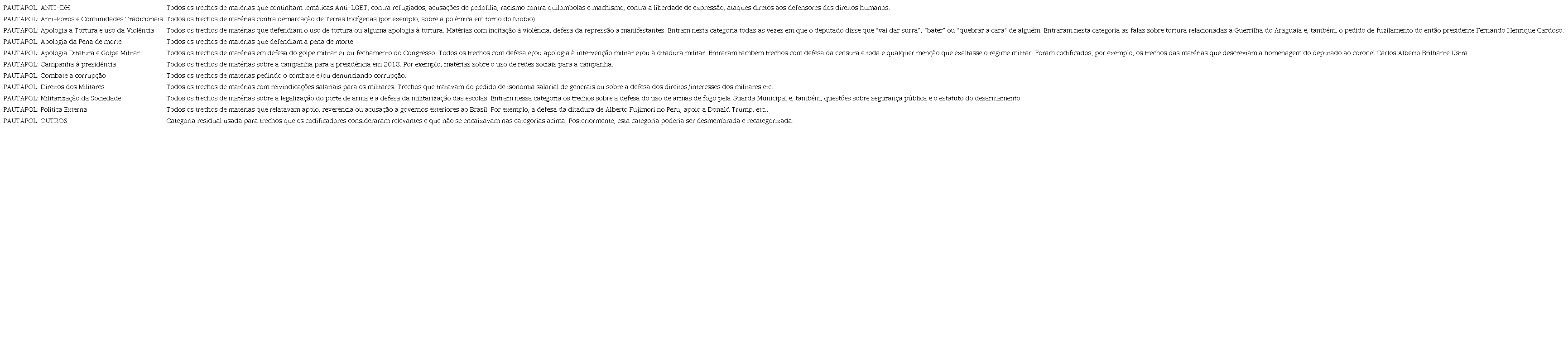 Uma vez caracterizados os dados, vejamos como foram construídas as categorias de análise que buscaram descrever as pautas políticas associadas ao deputado Jair Bolsonaro. Antes, porém, precisamos fazer algumas breves ressalvas. Enfatizamos o termo “associado” pois foram contabilizadas toda e qualquer pauta política professada ou atribuída a Jair Bolsonaro10. Alertamos para este fato visto que o que nos interessou metodologicamente foi identificar a probabilidade de algum leitor em potencial encontrar, ao longo de 30 anos de matérias de diferentes jornais e em diversos formatos, determinada pauta política que estivesse relacionada ao deputado. É bastante provável que a leitura de certas pautas políticas venha a desencadear algum tipo de tomada de posição, mas, sobre este aspecto, o presente esforço não teria como fazer nenhum tipo de conjectura.