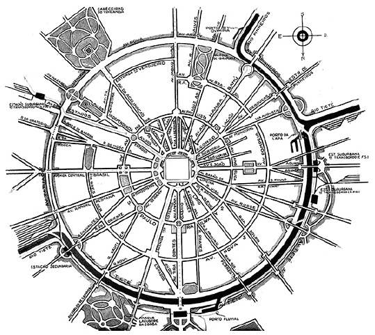 O Plano de Avenidas de Prestes Maia propunha uma reestruturação viária para São Paulo baseada na combinação entre avenidas perimetrais e avenidas radiais. De um ponto de vista aéreo, as perimetrais seriam percebidas como uma série de círculos concêntricos, lembrando as ondas que uma pedra provoca ao atingir uma superfície de água parada, ou a figura de um alvo. As avenidas radiais, por sua vez, seriam vistas como linhas retas, cortando as perimetrais em todas as direções e ligando as periferias ao centro da cidade. Dentre as avenidas perimetrais, uma ocupava um lugar de destaque, aquela que Prestes Maia chamava de Perímetro de Irradiação. Esse perímetro - que seria o primeiro e menor dos círculos e deveria ser construído em torno do centro histórico - serviria para ampliar a zona comercial e facilitar a distribuição de veículos em diversos pontos do centro. O principal propósito do perímetro era aliviar o congestionamento da área central.