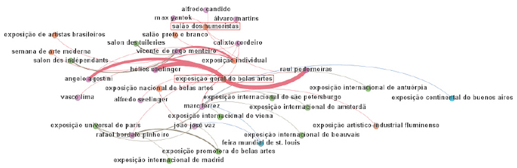 A participação em exposições estrangeiras, sobretudo na Europa (França, Áustria, Alemanha, Espanha e Portugal), torna mais complexos os processos de internacionalização desses agentes para além de seus locais de nascimento, possível formação estrangeira ou estação de trabalho, ressaltando a análise dos espaços de circulação dessas exposições e do capital simbólico que a elas fazia-se correspondente. Na rede abaixo (Figura 1), cujo intervalo temporal compreende os anos de 1868 a 1956, são apresentadas as passagens referidas com destaque, em vermelho, para a Egba e para o Salão dos Humoristas. Ao todo, somam-se 93 exposições, tomando como referência os colaboradores da revista, representados em roxo, durante toda sua trajetória. Afora as ocorrências em território nacional, representadas pela cor laranja, nas cidades de Rio de Janeiro (64,5%), São Paulo (3,22%) e Recife (4,3%), são significativas as exposições europeias (em verde), que reúnem 22,6% do total das instituições-sede das exposições estrangeiras.