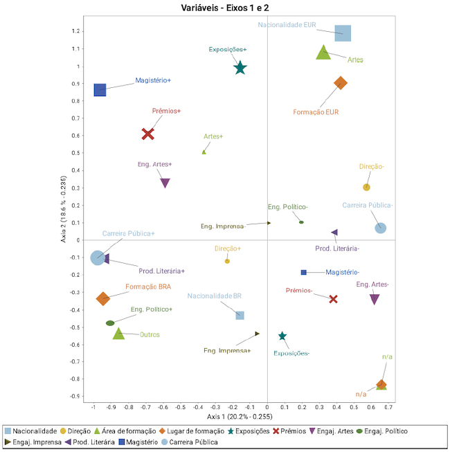 As maiores contribuições ao eixo 1 vêm da carreira pública (20,9%) e do lugar de formação (15,8%); em seguida têm-se o engajamento artístico, produção literária e área de formação, com porcentagens de contribuição bastante próximas. Para o eixo 1, as relações de oposição mais pronunciadas se dão entre aqueles nascidos no Brasil e que ocuparam cargos públicos e aqueles que não ocuparam cargos públicos e, também, não se engajaram em sociedades ou movimentos artísticos de maneira explícita. As maiores contribuições ao eixo 2 vêm da área de formação (22,3%) e da participação em exposições (19,3%), seguidas pela nacionalidade (18,2%). O eixo 2 não apresenta relações de oposição ou afastamento, mas de aproximação entre aqueles europeus, formados em Artes na Europa e com passagem por exposições, concentrando-os. As maiores contribuições ao eixo 3 vêm, respectivamente, da área de formação (24,6%) e do lugar de formação (24,4%), seguidas em menor escala pelo engajamento na imprensa (13,8%). Contudo, a relação estruturante entre área e lugar de formação não é aquela de oposição entre saberes, instituições de ensino ou Brasil e Europa, mas a ausência da formação superior (ou, nos casos de Gonzaga Duque e João do Rio, ausência de educação formal); esses agentes opõem-se àqueles com engajamento em associações de imprensa.