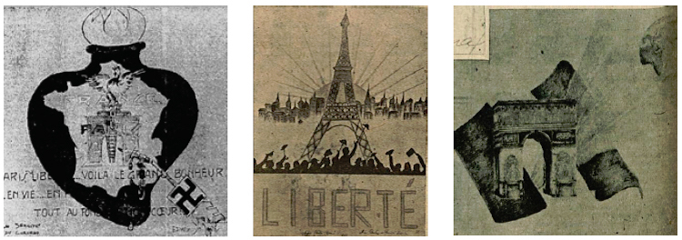 Dos trabalhos premiados, que foram expostos em jornais e revistas, em parte reproduzidos pela Figura 1, destacam-se os monumentos do Arco do Triunfo e da Torre Eiffel, representados dentro de um coração, com a frase em francês, em caixa alta “Paris Libertada... Aqui é a grande felicidade. Em alegria, em vida... Tudo ao fundo do coração”, com o nome da França lá em cima, junto ao Galo (símbolo da nação), que derrubam um mastro quebrado com a bandeira nazista e a águia alemã, situados fora. O terceiro trazia inscrito: “e, novamente, Paris ilumina o mundo”, com a bandeira da França disposta sob o Arco do Triunfo, do qual emana um feixe forte de luz que atinge um globo terrestre. No do meio, crianças e adultos fazem festa, com um grande sol que vem do céu e da própria cidade, enfeitada com bandeiras e com a palavra de ordem.