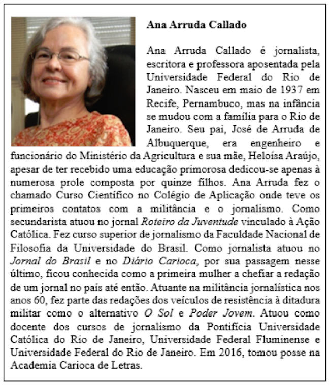 Circunstância similar vivenciou Ana Arruda Callado que conquistou os títulos de mestrado e doutorado depois de atuar como professora concursada na Escola de Comunicação da UFRJ. Entretanto, o caso de Ana Arruda Callado é exemplar porque condensa vários fenômenos de transformação do mercado jornalístico. Callado é um dos poucos membros da elite jornalística de sua geração a ingressar e progredir na profissão munida de um diploma de curso superior em jornalismo.