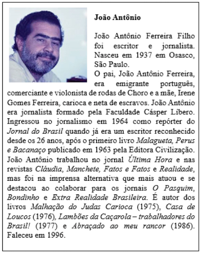Esta profissão não presta. Com o tempo, você vai empurrando a coisa com a barriga, meio pesadão. Sem qualquer alegria, garra ou crença, cutucado pela necessidade de sobrevivência apenas. O pior, se existe um, é que esta ocupação sovina e instável acaba como que atraindo azares, vícios, mortificações e levantando desejos de destruição, pespegando sentimentos culposos […] com honestidade, garra e jeito vivo, a profissão seria magnífica. Linda [...] (JOÃO ANTÔNIO, 1986, p. 81).