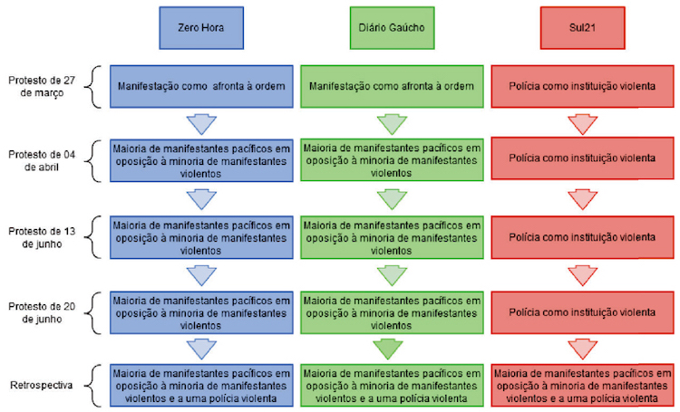 Conforme se verificou no estudo, ao longo do ano de 2013, a disputa interpretativa foi caracterizada pela alternância, em cada um dos jornais, de diferentes esquemas. A figura a seguir demonstra quais os enquadramentos construídos por Zero Hora, Diário Gaúcho e Sul21 para cada evento analisado: