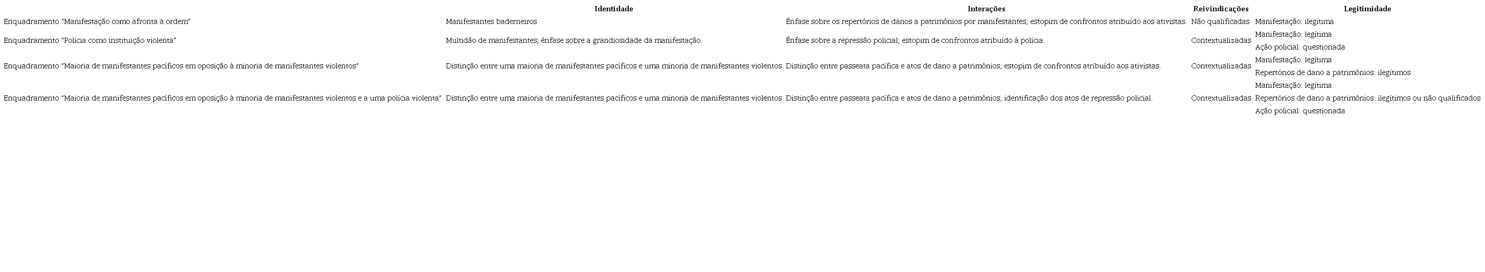 A partir desse esforço analítico, foi possível o desenvolvimento de uma tipologia dos enquadramentos utilizados pelos jornais ao longo do ano. Tal tipologia consiste na apresentação de esquemas interpretativos que simplificam a experiência (ANCELOVICI, 2002) e evidenciam padrões de cobertura aos eventos analisados. Diante dos dados da pesquisa, foram identificados quatro enquadramentos principais, construídos pelos jornais ao longo do ano e assim denominados nesse trabalho: “Manifestação como afronta à ordem”; “Polícia como instituição violenta”; “Maioria de manifestantes pacíficos em oposição à minoria de manifestantes violentos”; “Maioria de manifestantes pacíficos em oposição à minoria de manifestantes violentos e a uma polícia violenta”.