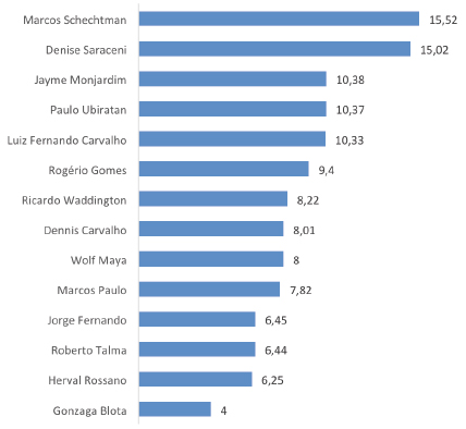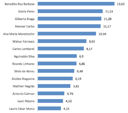 Para além dessas questões, há que se notar, também, que a participação de pretos e pardos nas novelas varia consideravelmente de acordo com o nome de quem a assina. No Gráfico 4, temos a lista dos autores principais que escreveram oito ou mais novelas para a Rede Globo, entre 1985 e 2014, e a proporção média de não brancos em suas novelas. Nesse quesito, as novelas de Benedito Ruy Barbosa se destacam das demais, tendo em média 13,62% de não brancos. Isso se explica, em grande medida, pela preferência do autor em escrever narrativas sobe a vida rural, que envolvem a vida de migrantes7. Há que se notar, também, o papel do escritor na adaptação à televisão de obras icônicas formadoras da concepção da brasilidade em formação, rural e mestiça.