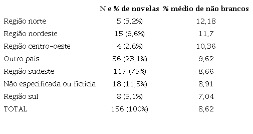 No rol de novelas “menos brancas” há também aquelas ambientadas em espaços sociais marginais, seja na geografia regional do país ou no ambiente urbano, como Salve Jorge, cuja locação fundamental foi uma favela carioca; Araguaia, ambientada nas margens do rio homônimo; Cama de Gato, inicialmente ambientada nos Lençóis Maranhenses. De fato, a distribuição das personagens não brancas no corpus total parece obedecer uma certa divisão das regiões do país, como indica a Tabela 1. Há maior probabilidade das novelas com maior número de pretos e pardos se situarem nas regiões Norte e Nordeste do país, seguidas da região Centro-Oeste e de novelas ambientadas em outros países: