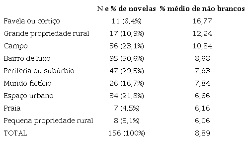 Algo semelhante se passa com a distribuição de pretos e pardos pelos diferentes espaços sociais. Novelas ambientadas em favelas ou cortiços tendem a ter uma média de personagens não brancos bastante elevada (16,77%), quase o dobro da média geral. Em seguida, os pretos e pardos aparecem relativamente mais em novelas que se passam em grandes propriedades rurais (12,24%) e no campo (10,84%). As novelas que se desenrolam basicamente em espaços urbanos são, todavia, majoritariamente brancas, como indica a Tabela 2: