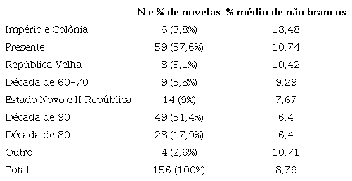 No que se refere ao período histórico no qual se ambientam as novelas, nossos dados corroboram as conclusões de outros levantamentos similares (GRIJÓ; SOUSA, 2012). As personagens não brancas costumam ter uma presença relativa maior no elenco das novelas ambientadas no Brasil Colônia e no Império, cuja média de personagens pretos e pardos atinge 18,48%, mais do que o dobro da média geral. Em segundo lugar, aparecem as novelas ambientadas no Estado Novo, nas décadas de 1960 e 1970, e no presente, oscilando entre 7% e 11%. Nesses três cortes temporais, a média de não brancos na trama central das novelas se aproxima da média de não brancos nas novelas em geral. São nas novelas ambientadas nas décadas de 1980 e 1990 que há a menor participação de não brancos, conforme indica a Tabela 3.