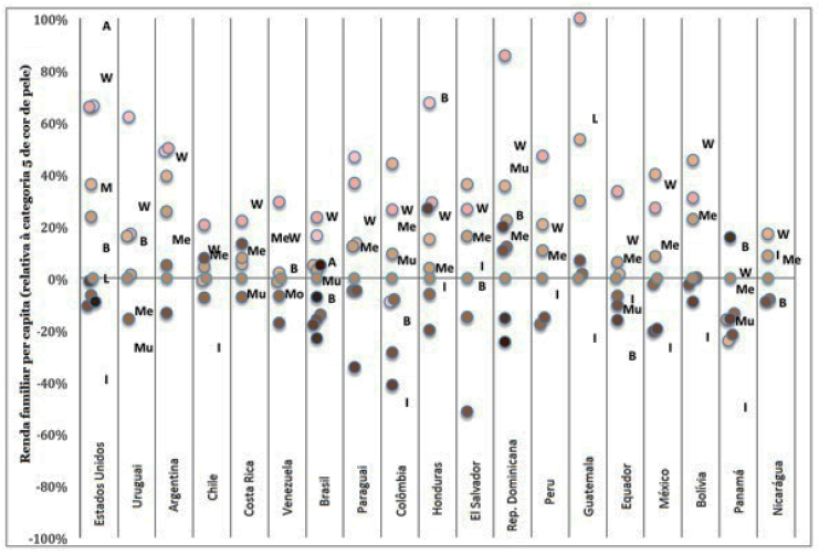A Figura 1 demonstra o poder dessa abordagem multidimensional. Ela se baseia em dados disponibilizados recentemente sobre os Estados Unidos e sobre 18 países da América Latina em uma análise de desigualdade de renda familiar nas Américas, utilizando duas medidas: cor da pele percebida e autoclassificação racial (cf. Bailey et al., 2014). Os resultados mostram hierarquias de cor e de raça nos países analisados. A vantagem de brancos e a desvantagem de indígenas manifestam-se de modo semelhante entre os países, ao passo que negros em alguns países possuem maior média de renda que outros grupos raciais. A desigualdade racial de renda pode ser mais bem compreendida em alguns países a partir de categorias raciais, como no caso da Costa Rica e talvez até mesmo do Brasil e dos Estados Unidos. Em um número maior de países, porém, a cor da pele parece fornecer uma lente melhor sobre a desigualdade. Entre esses últimos, estão incluídos Venezuela, Uruguai e Paraguai.