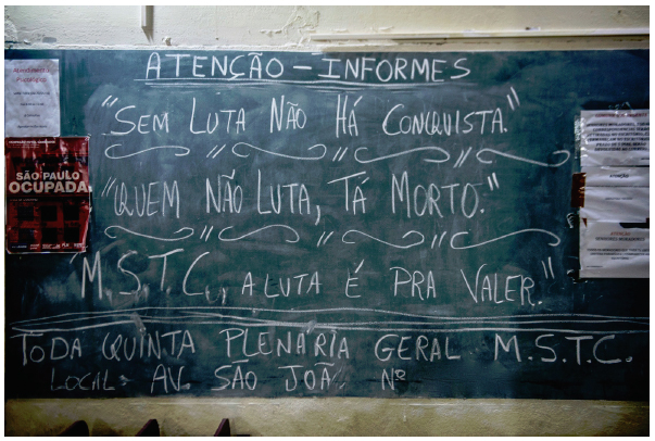 Quinze andares abaixo, na entrada, há degraus em mármore, grades de ferro em frente a uma enorme porta vermelha feita inteiramente de metal, que tem uma parte corrediça para se ver quem está do outro lado. Foi atrás desta porta que, em 2012, o Movimento dos Sem Teto do Centro (MSTC) se abrigou contra a polícia para ocupar este prédio. Depois, residentes me contam que, ao ocuparem o imóvel, suas equipes coletivamente removeram 15 toneladas de entulho, antes que 170 famílias pudessem mudar-se propriamente: 500 pessoas foram alojadas em um edifício de 15 andares sem elevadores, saneamento, eletricidade ou privacidade neste período inicial.