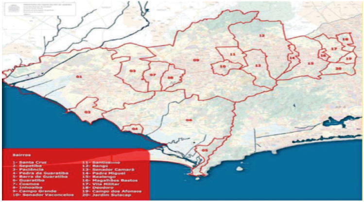 A Zona Oeste do Rio de Janeiro possui uma extensão territorial de 592,33 km2 e cerca de dois milhões de habitantes5. Além de uma ampla extensão territorial e densidade populacional, existem limitações impostas à militância pela atuação de grupos milicianos e altos índices de pobreza e violência estrutural, os mais elevados de toda a cidade. Ainda que seus bairros compartilhem de espaços de pobreza, essa não se observa de forma homogênea, com habitações de classe média e média alta junto às moradias precárias, características das favelas cariocas.