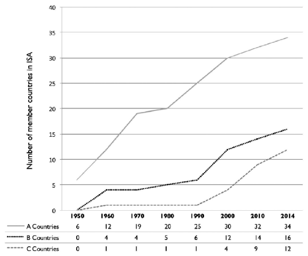 Voltando-se para os membros individuais da ISA, constatamos que 65% são de países A, 22% de países B e 13% de países C - novamente, algo bastante discrepante, apesar de as taxas de adesão serem bem mais baixas para países B e C. Não obstante, os dados da Figura 2 mostram uma pequena, mas contínua, queda na proporção de membros de países A: de 74%, em 2002, para 65%, em 2014. A Figura 3 mostra o mesmo progresso na filiação de Associações Nacionais. Ficou no passado o período em que a ISA era um clube de algumas centenas de membros da Europa, dos EUA e de alguns membros do bloco soviético.