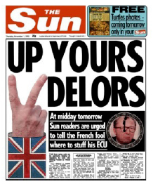 O ponto concreto que levou a uma tensão dentro do seu próprio governo e que iria contribuir para sua queda em 1990 foi a integração monetária. Delors tinha lançado um plano de unificação monetária em três estágios sendo o Mecanismo Europeu de Taxas de Câmbio (ERM na sigla inglesa) o primeiro passo. Thatcher tentou barrar a entrada no ERM por entender que isso abriria a porta para a moeda única e por acreditar, por ideologia, nas vantagens de câmbio flutuante, enquanto seus ministros e o presidente do Banco Central entenderam o ERM como forma de controlar a inflação ao ligar a Libra ao marco alemão. Delors com seu “big bang approach”, tinha colocado o velho dilema para o governo britânico: ficar de fora ou entrar para tentar esvaziar a proposta (WALL, 2008). Em outubro 1990, depois de várias trocas de ministros, com John Major agora na Fazenda, Thatcher cedeu e o RU entrou no ERM, mais uma vez de forma tardia e tumultuada. Cabe enfatizar que a briga de Thatcher não era somente com Delors, mas também com Kohl, uma vez que ela se opôs também firmemente à unificação da Alemanha, levantando o temor da síndrome de uma Europa germânica, ao invés de uma Alemanha europeizada (a chave política churchiliana). De seu lado, Kohl entendeu que a unificação deveria ser acompanhada de um processo de ampliação da integração europeia para encontrar menos resistências e por isso apoiou o ativismo de Delors. Este anunciou, em seguida, que a moeda única seria uma realidade até o ano 2000, o que provocou duas reações no RU: uma fala de Thatcher dizendo que o Parlamento britânico jamais concordaria e a famosa capa do jornal The Sun (ver figura 1):