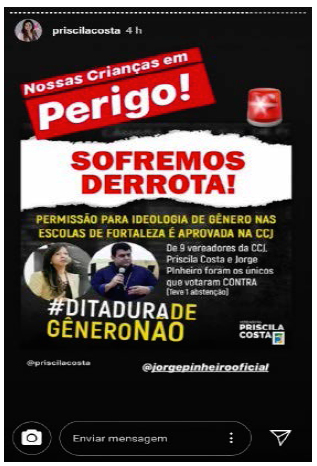 Derrotados na referida comissão, a dupla de vereadores iniciou uma campanha difamatória do projeto, do vereador e do sindicato de professores, fazendo circular a ideia de que o projeto tinha como objetivo ensinar “ideologia de gênero”14 para as crianças, o que os levou a mobilizar todos os elementos presentes nas diversas campanhas de desinformação que se fizera no país quando o “pânico moral”15 em torno da questão foi reproduzido por ocasião das votações dos planos de educação. Uma imagem, postada por Priscila em seu Instagram, acionava alguns dispositivos enunciativos dignos de nota. A começar pela chamada, em vermelho (cor pela qual a esquerda, e o PT sobretudo, são identificados), alertando para um “perigo” que cercava as crianças: a “permissão para ideologia de gênero nas escolas”, para a qual somente ela e Jorge votaram contra. O alerta, assim, produzia a representação dos dois vereadores que se postavam tanto como “denunciantes” do perigo quanto como “defensores” das crianças; e, ainda mais, ao utilizarem a hashtag #ditaduradegêneonão, ainda se postavam como “democratas”.