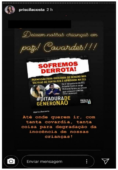 Após a votação na Comissão, Priscila fez um discurso na tribuna, horas depois postado em suas redes sociais com o título: “Imposição de ideologia de gênero é censura de liberdades”. Seguia-se ao título a seguinte mensagem: “Longa batalha e derrota na CCJ. Em Fortaleza, foi aprovada na Comissão, a permissão para o ensino da Ideologia de Gênero nas Escolas. Depois de ouvir a bancada do PT afirmar que Ideologia de Gênero não tem relação com Liberdade de Consciência. Vereadora Larissa Gaspar explica para todos, o caráter ditatorial da tal ideologia”17. Comecemos pelo título: um total desvirtuamento do projeto, que não versava sobre ensino de qualquer temática em particular, muito menos do que nomeou como “ideologia de gênero”; o texto original não indicava “censura” alguma, mas exatamente a “liberdade de cátedra”, que, agora, segundo a vereadora, estaria ameaçada pela “ideologia de gênero”, que foi incorporada ao texto original por meio da emenda de Jorge Pinheiro, ainda que em teor negativo, pela “proibição” de seu “ensino”. Por isso, no momento em que sua emenda foi derrotada, iniciou-se a campanha difamatória18 de dizer que o projeto visava ensinar aquilo que não se proibia.