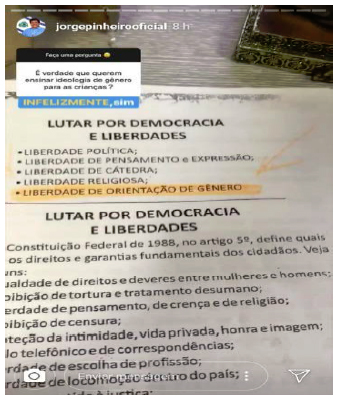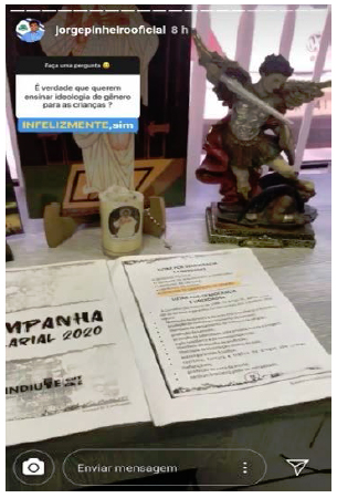 Para reforçar ainda mais o espírito de objeção ao projeto e ao sindicato, o vereador carismático compartilhou a página do material do sindicato em suas redes abaixo de imagens religiosas, com destaque para a do Arcanjo São Miguel, que na mitologia católica é crido como aquele que derrotou o demônio22. Respondendo a uma pergunta de um seguidor, se era verdade que queriam “ensinar ideologia de gênero nas escolas”, o vereador responde positivamente, mas sem mostrar onde, no texto do projeto, isso estava dito, recorrendo, por sua vez, ao material do sindicato que, mesmo não dizendo o que sua postagem dizia, servia como prova semântica para seus objetivos.