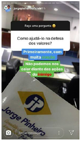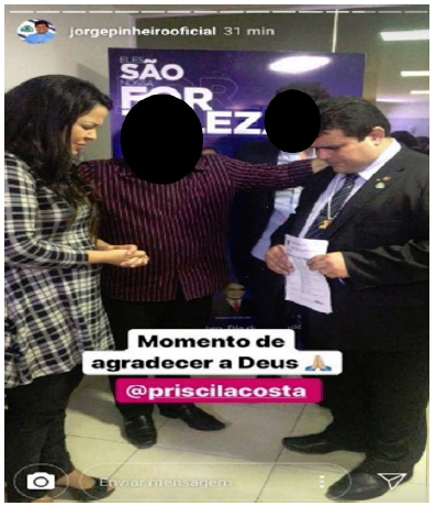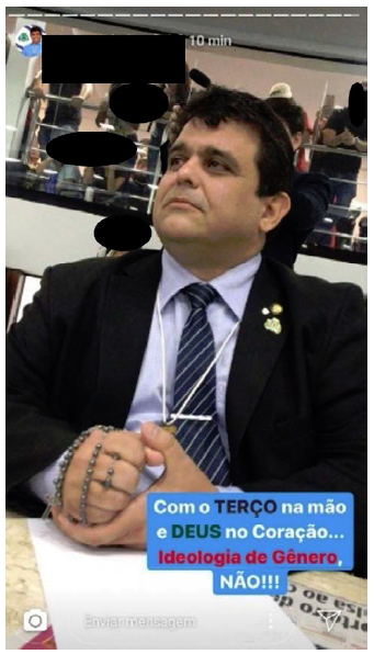 Reforçando a imagem do pacto político-religioso, Jorge posta-se no plenário, e nas redes, com o terço (objeto católico de devoção mariana) na mão, reproduzindo a encenação de uma batalha espiritual em curso naquele espaço, mostrando-se “preparado” para o momento pelas orações de seus seguidores-eleitores, aos quais havia pedido, como vimos anteriormente, “muita oração”. A imagem opera ao mesmo tempo: a legitimação do vereador como agente do campo religioso e do campo político; a deslegitimação do projeto e da esquerda (novamente, a cor em vermelho); e a prestação de contas ao seu eleitor (se pedira oração, agora era o momento de ele mesmo mostrar-se como “homem de oração”).
