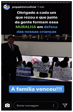 Nas redes sociais, a encenação da vitória pela retirada do projeto pode ser observada na imagem a seguir, produzindo a encenação da comemoração da vitória como algo a ser compreendida, por seus seguidores, no plano espiritual:
