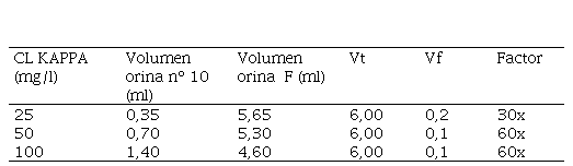El procedimiento se llevó a cabo en 2 etapas: etapa I) Verificación cualitativa/ semicuantitativa del proceso de concentración a través de la electroforesis de orinas que abarcaban amplio rango de proteinuria, posteriormente a su concentración en condiciones controladas. Se tuvo en cuenta: volumen inicial, volumen final, tiempo y velocidad de centrifugación como variables a controlar; etapa II) Ensayo de recuperación de cadenas livianas libres kappa.
