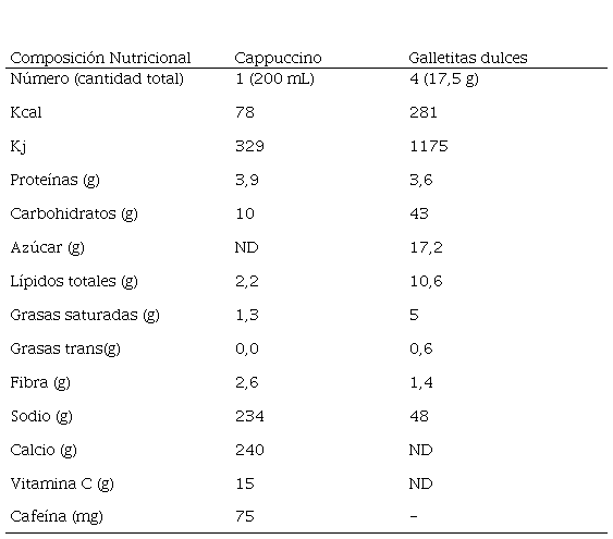 Siguiendo el procedimiento de flebotomía estandarizado1, los voluntarios concurrieron con 12 h de ayuno, entre las 7 y 9 a.m., para realizar la primera flebotomía (T.). A continuación, recibieron un desayuno estandarizado, que consistió en 200 mL de cappuchino elaborado por una marca comercial (leche, café y cacao) y 4 galletitas dulces (Tabla I). Una hora después de haber terminado la ingesta se realizó la segunda extracción de sangre (T1). Durante el período de tiempo transcurrido entre T0 y T1, los participantes permanecieron sentados y en reposo.