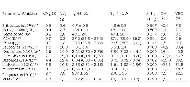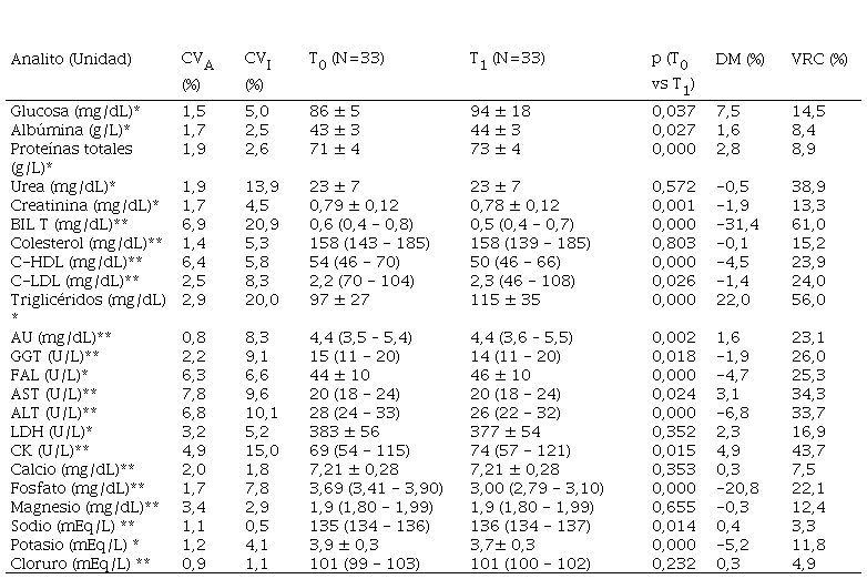 La relevancia clínica de los cambios observados en las pruebas bioquímicas se analizó por comparación entre la diferencia media (DM) (%) calculada para cada parámetro y su respectivo valor de referencia del cambio (VRC). Cuando la DM (%) fue mayor que el VRC, el cambio entre las mediciones se consideró clínicamente relevante.