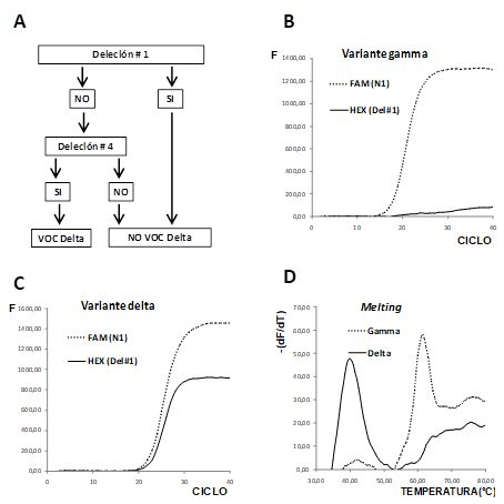 A. Algoritmo para tamizaje de muestras en busca de variante delta. B. Resultado de amplificación dúplex N1-ORF1ab en una muestra que posee la deleción #1 (por ejemplo,gamma). C. Resultado de amplificación dúplex N1-ORF1ab en una muestra correspondiente a VOC delta. D. Análisis de la deleción # 4 mediante melting de sonda posterior a la amplificación para una muestra VOC delta (línea continua; Tm=40ºC) y una muestra de otra variante, en este caso,gamma (línea de puntos; Tm=60ºC).