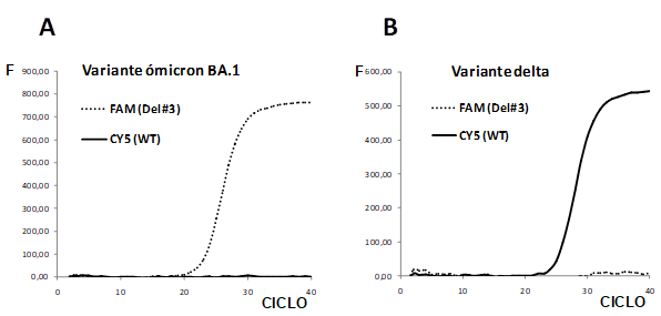Resultado típico del ensayo para la detección de la deleción #3 sobre una muestra que posee dicha deleción (variante ómicron BA.1)(A) y sobre una muestra sin deleción #3 (en este caso, variante delta) (B). En ambos casos, se muestran las lecturas en los canales FAM (específico para detección de deleción #3) y Cy5 (específico para detección de secuencia sin deleción #3).