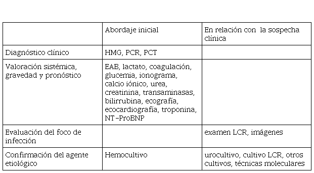 En los pacientes con sospecha de sepsis, es necesario realizar exámenes de los biomarcadores de laboratorio en relación con el objetivo buscado. Algunos de los análisis que resultan de utilidad en el paciente séptico se observan en la Tabla III.
