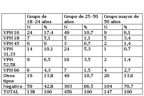 Se estudiaron 741 pacientes divididas en 3 grupos etarios: grupo 1 (18-24 años) (media=21,6; IC95% 21,7-21,9; n=138), grupo 2 (25-50 años) (media=35,2; IC95% 34,5-35,8; n=456) y grupo 3 (mayor de 50 años) (media=62,17; IC95% 60,7-63,6; n=147). Para el análisis de los resultados, se excluyeron las muestras de las pacientes en las que no hubo amplificación del gen control en el test de detección del VPH-ar.