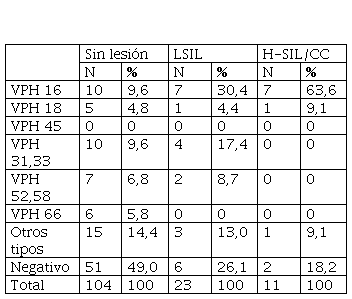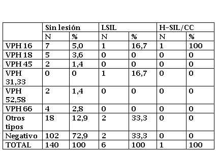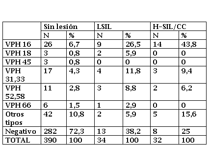 La prevalencia de infección por VPH-ar en las pacientes del estudio se muestra en la tabla I. Las prevalencias de los distintos tipos de VPH-ar en función de las lesiones intraepiteliales escamosas se presentan en las tabla II, tabla III y tabla IV. En el grupo 1, el VPH16 se asoció al 63,6% (7/11) de las lesiones H-SIL/CC. En el grupo 2, el VPH 16 se asoció al 43,8% de las lesiones H-SIL/CC (14/32). En el grupo 3, se detectó un caso de VPH16 asociado a H-SIL/CC.