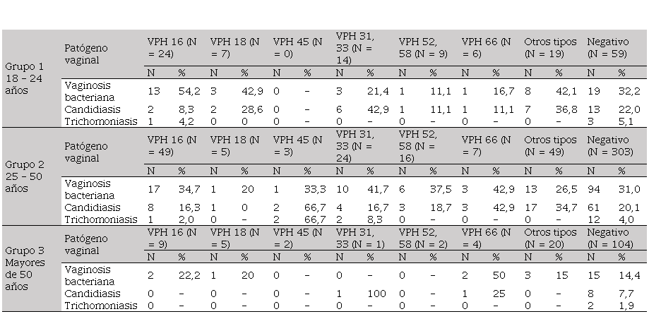 En el grupo 3, debido al reducido número de pacientes de la muestra, no se puede objetivar la relación entre VB, candidiasis y los diferentes tipos de VPH-ar. En nuestra casuística, encontramos una prevalencia baja de trichomoniasis (menos del 4%), por lo que no podría estar relacionada con ningún tipo de VPH-ar en particular. Esta baja prevalencia se debe a que se estudiaron poblaciones tanto sintomáticas como asintomáticas. Abdul Aziz et al.37 informaron hallazgos similares y describieron una prevalencia de trichomoniasis del 0,9%. En cambio, Kamara et al.39 informaron una prevalencia de trichomoniasis del 18%. Estas disparidades en la prevalencia podrían deberse a condiciones socioeconómicas distintas y a diferencias étnicas.
