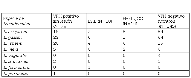 De 741 muestras totales del estudio, se detectó microbiota lactobacilar en 479 muestras (grupo 1 n=82; grupo 2 n=283 y grupo 3 n=114), de las cuales se pudieron caracterizar 253 lactobacilos cultivables. La frecuencia de las diferentes especies de lactobacilos encontradas en las pacientes del estudio, según el tipo de lesión por VPH se observa en la tabla VI. Lactobacillus jensenii presentó una prevalencia de 42,9 % en pacientes con H-SIL/CC, con respecto a un 24,8 % en el grupo control (OR=2,27; p=0,08). Lactobacillus iners presentó una prevalencia de 14,3 % en pacientes con H-SIL/CC, con respecto a un 4,1 % en el grupo control (OR=3,86; p=0,09). Las pacientes con H-SIL/CC tuvieron una prevalencia de 21,4 % de L. crispatus.