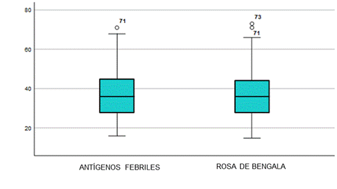 Los títulos reactivos para ambas técnicas fueron bajos, en el rango de 1/40 a 1/160 para AF, con 178 de 212 registros reactivos de 1/40, mientras que se observaron resultados en el rango de 25 UI/ml a 100 UI/ml para RB, con 119 de 129 registros reactivos en el rango de 25 UI/ml a 50 UI/ml. Estos resultados reactivos a títulos bajos sugieren resultados falsos positivos en ambos casos. Según el fabricante de AF, son concluyentes de enfermedad solamente títulos mayores de 1/320.
