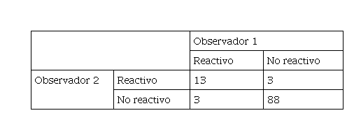 Luego de realizar la concordancia entre observadores para la técnica de RB, se pudo observar un índice kappa de Cohen de 0,78 (EE 0,0863), con IC95% (0,61 - 0,95) y valor p: 0,00001. En la Tabla I, se pueden observar seis resultados discordantes (reactivo/no reactivo) entre los dos observadores.