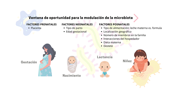 Se han descrito varios factores que modulan el establecimiento de la microbiota intestinal en la vida temprana y que son determinantes para la salud del individuo durante toda su vida. Entre estos, destacan dos factores clave que son: el tipo de parto -vaginal o por cesárea- y el tipo de lactancia -materna o artificial-. Dado que el establecimiento y la maduración de la microbiota intestinal ocurre en los llamados “1000 días”, que van desde la concepción hasta los primeros 2 años de vida del niño, este período se considera una ventana crítica de oportunidad para realizar intervenciones que contribuyan a la conformación de una microbiota saludable8 (Figura 1).