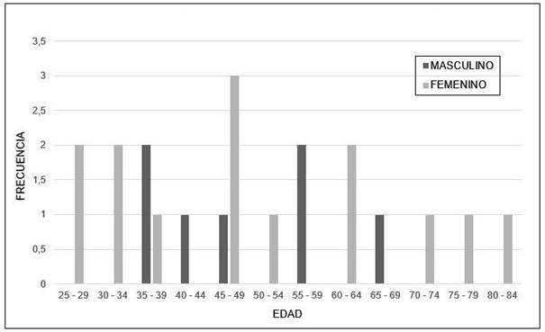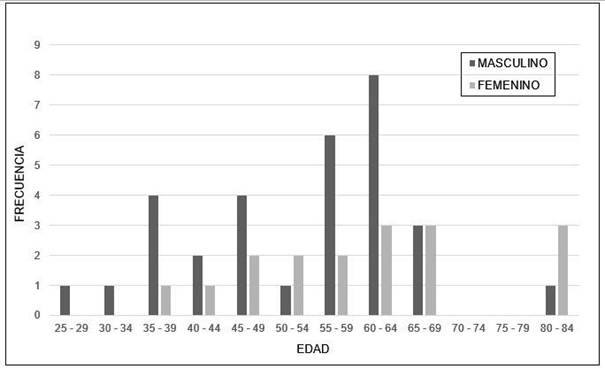 Se analizaron los datos de 48 pacientes internados con diagnóstico de COVID-19 (pacientes caso) y de 21 pacientes considerados como controles sanos (pacientes control). La edad media y desviación estándar de los pacientes caso y control fue de 55,75 ± 13,37 y 49,62 ± 16,36 años, respectivamente. En las Figura 1 y Figura 2, se puede observar la distribución por edad y género para los pacientes caso y control, respectivamente. En los pacientes control, se midieron los niveles de IgM e IgG tanto para aCL como para aβ2GPI y se compararon con los valores obtenidos de los pacientes caso. En la Figura 3, se pueden observar los resultados de estas comparaciones.