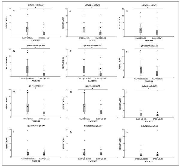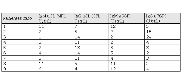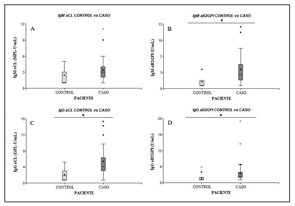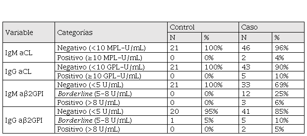 Al medir IgG aCL, en pacientes control, el promedio observado fue de 2,19 ± 1,25 GPL-U/mL (máximo = 5 GPL-U/mL) y, en los pacientes caso, el promedio fue de 5,17 ± 3,26 GPL-U/mL (máximo = 14 GPL-U/mL). En IgG aβ2GPI, los promedios fueron de 1,62 ± 1,24 U/mL (máximo = 6 U/mL) y de 3,50 ± 3,75 U/mL (máximo = 24 U/mL) para pacientes control y pacientes caso, respectivamente.