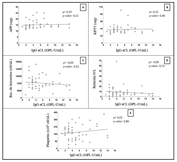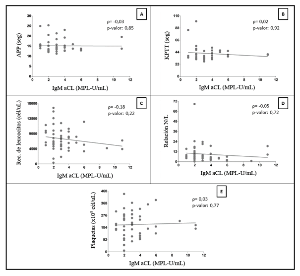 Se analizó la correlación entre los aFL y los valores de hemostasia -hematología. En la Figura 4 se pueden observar las correlaciones entre los valores de IgM aCL y las cinco variables de hemostasia - hematología. Las asociaciones entre todos los parámetros fueron no significativas, y los datos tuvieron una alta dispersión que no permitió detectar una relación entre las distintas duplas analizadas.