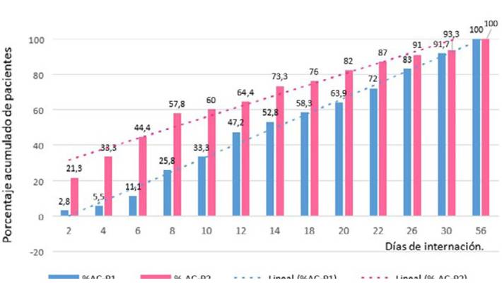 Finalmente, se analizó el tiempo desde el ingreso de los pacientes hasta el estado de portador; en los pacientes del PI, los días hasta el HR (+) resultaron en promedio 18,1 (mediana 13,7 [RIC: 15,8]) y, para los pacientes del PP, resultaron en promedio 11,0 (mediana 7 [RIC: 12]), lo que muestra que los pacientes del PP se colonizaron más rápidamente. En forma más gráfica, a las 48 h de internación, el 21,3% de los pacientes del PP ya presentaban un HR (+), mientras que en el PI solo, un 2,8% (Figura 1; Tabla I).