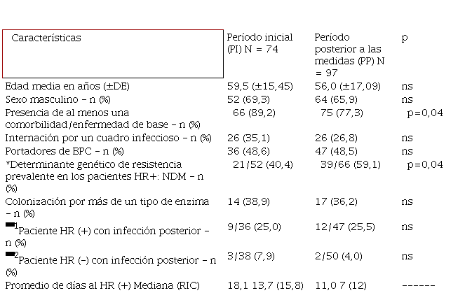 En ambas cohortes, el porcentaje de pacientes colonizados por más de un tipo de carbapenemasas resultó similar: predominaron las metalo-ß-lactamasas (p>0,05), y NDM fue la enzima prevalente, con un incremento significativo en la segunda etapa de vigilancia (p=0,04; Xi2=4,07; OR=0,46 [0,22-0,98])6; el porcentaje de infecciones causadas por BPC, posterior al HR fue significativamente mayor en los pacientes portadores respecto de los no portadores (p<0,05) (Tabla I y Tabla II).
